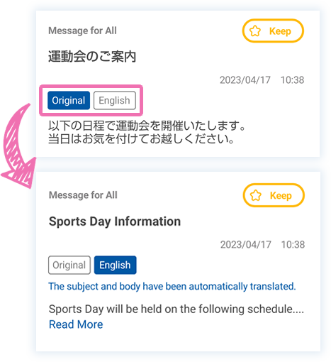 英語のほか複数言語の選択が可能です。登録者アプリでは設定した言語に応じて