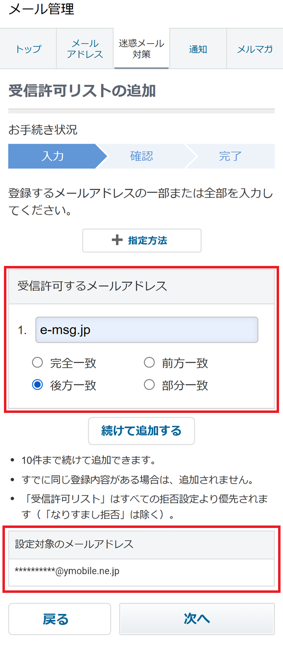 「受信許可するメールアドレス」に「e-msg.jp」を入力し、「後方一致」を選択してください。