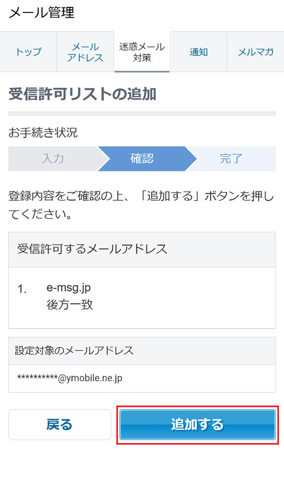「受信を許可するメールアドレス」に「e-msg.jp」が「後方一致」が登録されているか確認してください。