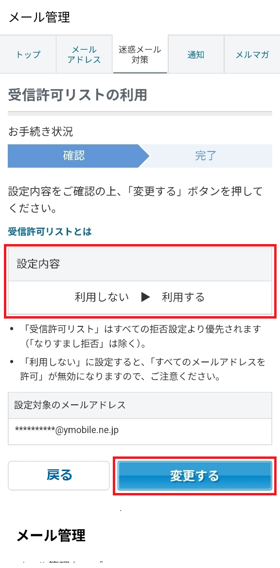 ◆「受信許可リストの利用」が「利用中」の場合は②「確認する」を押して(9)から操作下さい。