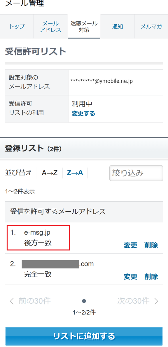 7)「受信許可リスト」の「受信許可リストの利用」の欄を確認する